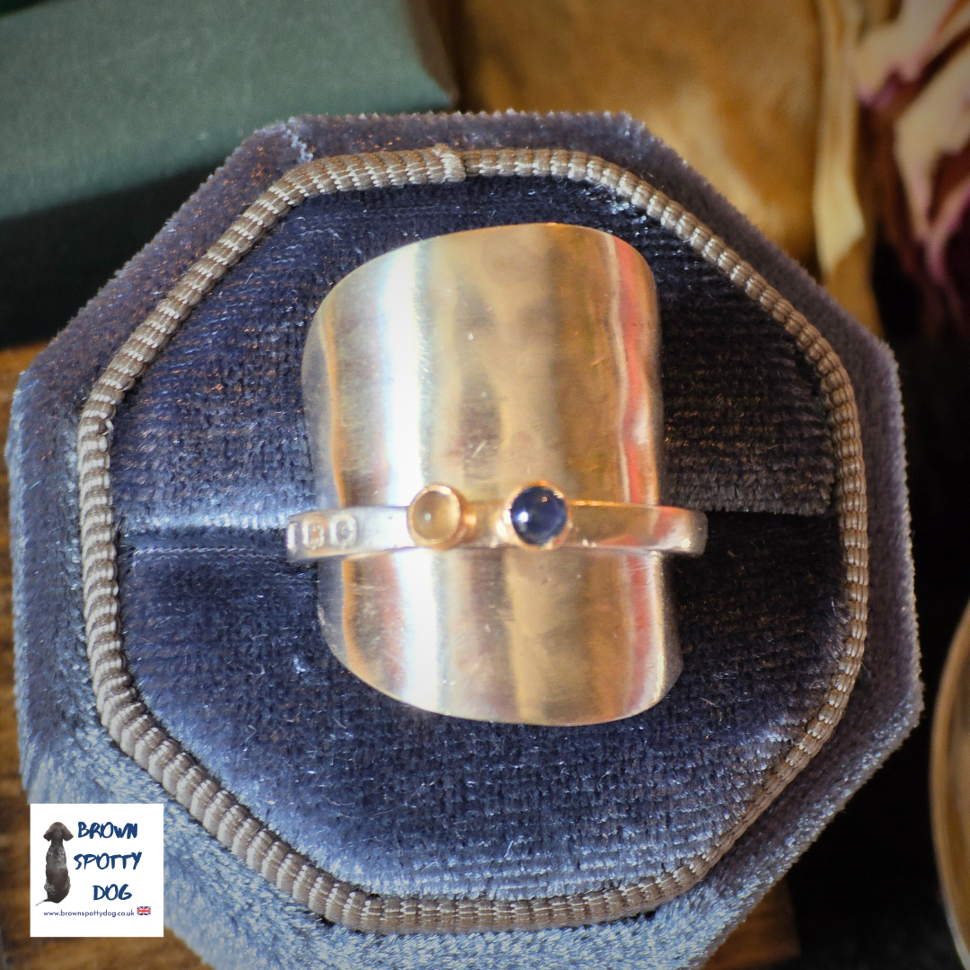 This ring features a 9ct yellow gold set Sapphire and a 9ct yellow gold set Moonstone.
