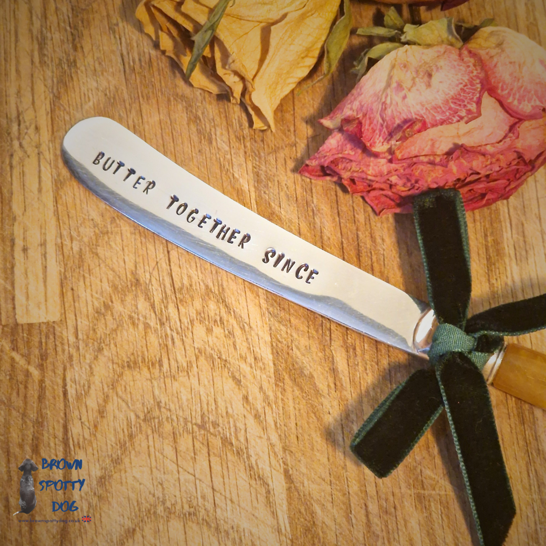 The knife you are ordering only says Butter together, however you can choose to add the words "since a specific year". Creating a personalised butter knife with the final example text being "Butter together since 2016". To choose this, please order a personalised butter knife and add your text or simply add a note to this when your order.