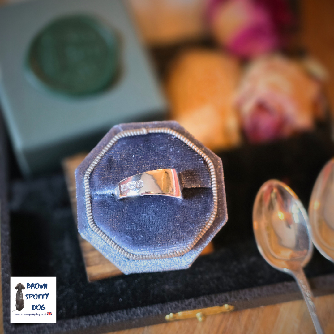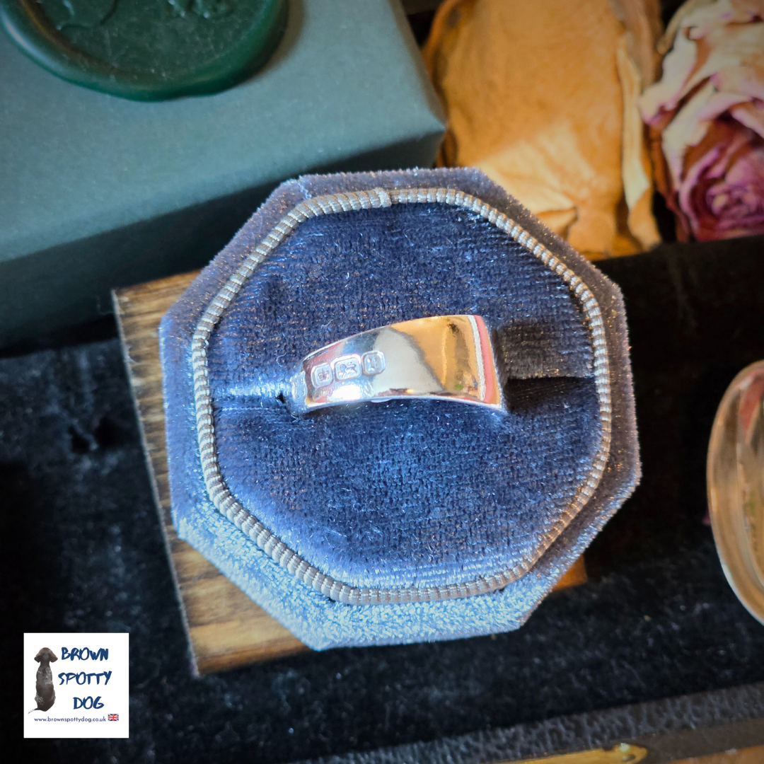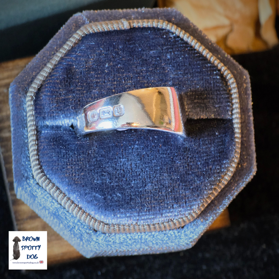 This elegant ring is meticulously crafted from a repurposed sterling silver spoon, originally hallmarked by the Sheffield Assay Office in 1913. Weighing 5.8 grams, the piece retains its original hallmark, preserving its historical authenticity. It has been legally transformed into a unique item of jewellery in accordance with the Hallmarking Act of 1973. Each ring is accompanied by an official certificate of conversion and a unique reference number, ensuring its provenance and compliance.