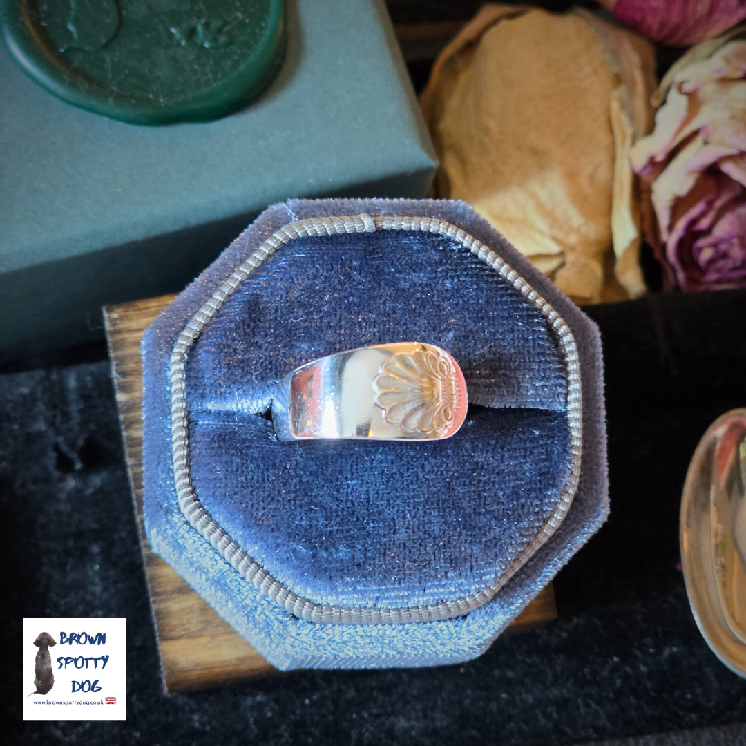 This elegant ring is meticulously crafted from a repurposed sterling silver spoon, originally hallmarked by the Sheffield Assay Office in 1936. Weighing 4.2 grams, the piece retains its original hallmark, preserving its historical authenticity. It has been legally transformed into a unique item of jewellery in accordance with the Hallmarking Act of 1973. Each ring is accompanied by an official certificate of conversion and a unique reference number, ensuring its provenance and compliance.