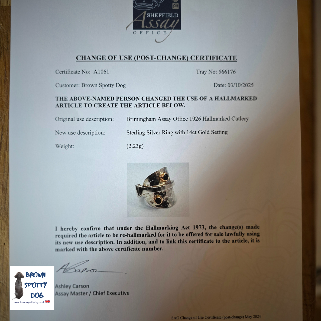 These Sterling Silver rings have been legally transformed into a unique item of jewellery in accordance with the Hallmarking Act of 1973. Each ring is accompanied by an official certificate of conversion and a unique reference number, ensuring its provenance and compliance.