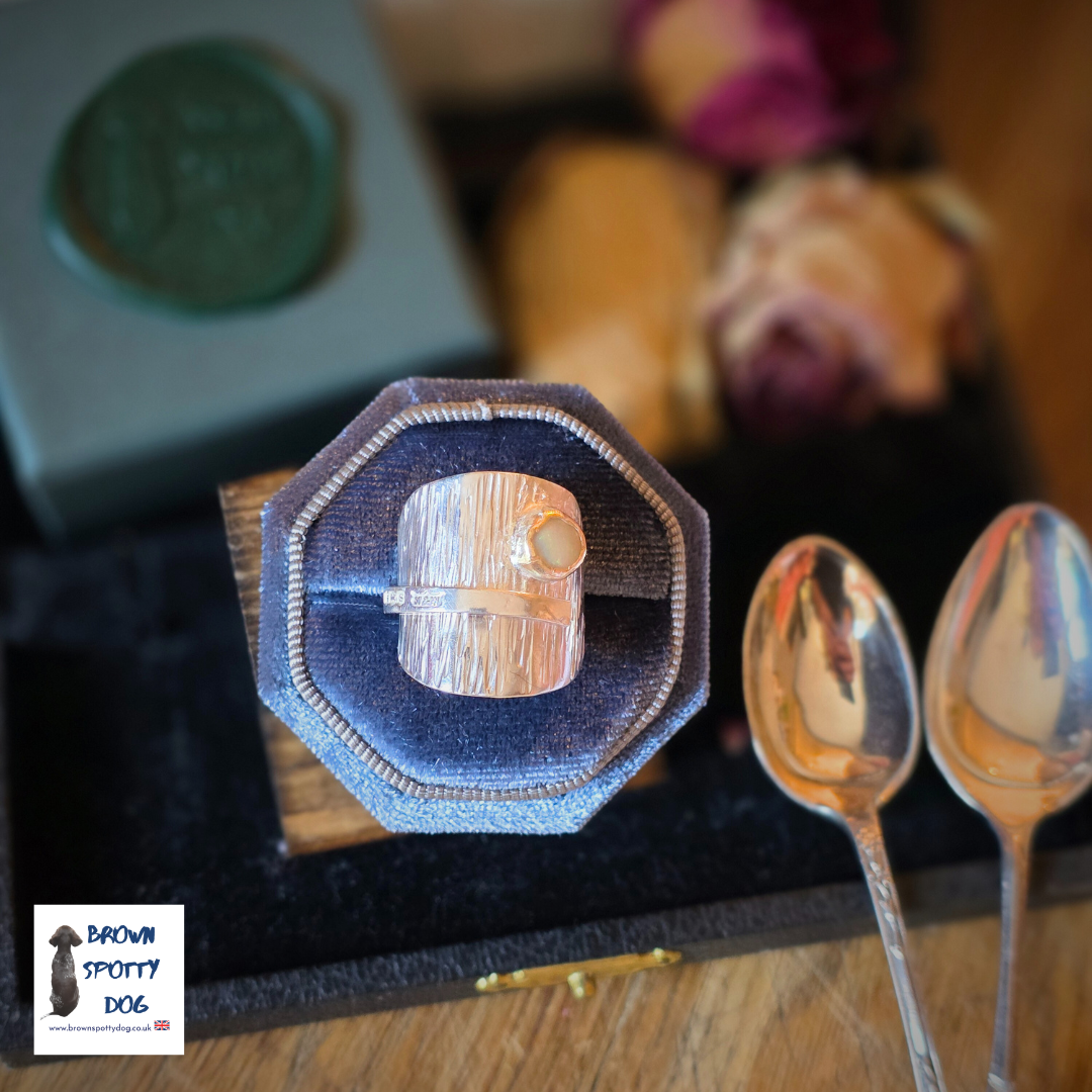 This elegant ring is meticulously crafted from a repurposed sterling silver spoon, originally hallmarked by the Sheffield Assay Office in 1935. Weighing 8.51 grams, the piece retains its original hallmark, preserving its historical authenticity. It has been legally transformed into a unique item of jewellery in accordance with the Hallmarking Act of 1973. Each ring is accompanied by an official certificate of conversion and a unique reference number, ensuring its provenance and compliance.