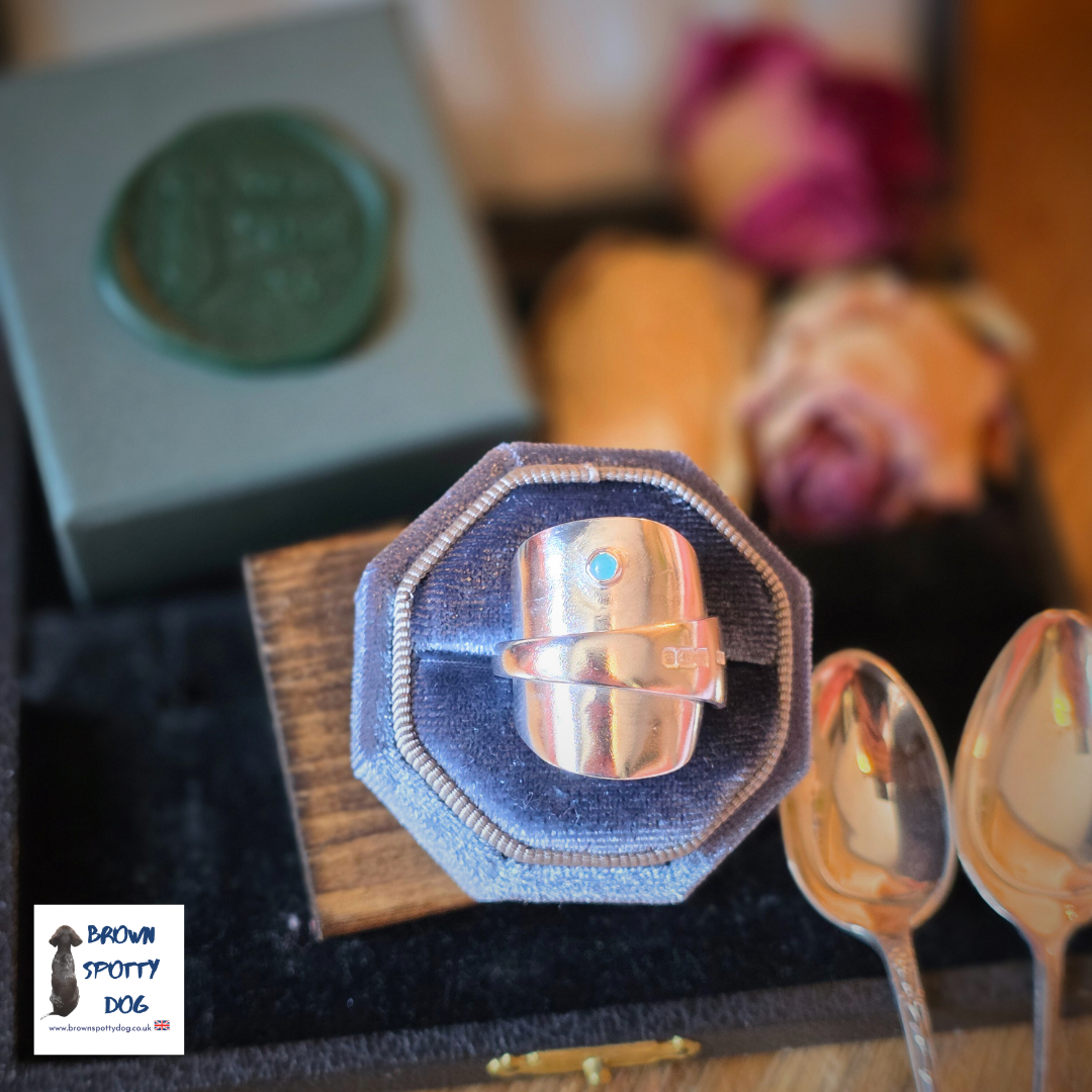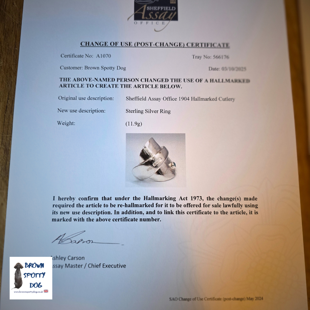 This elegant ring is meticulously crafted from a repurposed sterling silver spoon, originally hallmarked by the Sheffield Assay Office in 1904. Weighing 11.9 grams, the piece retains its original hallmark, preserving its historical authenticity. It has been legally transformed into a unique item of jewellery in accordance with the Hallmarking Act of 1973. Each ring is accompanied by an official certificate of conversion and a unique reference number, ensuring its provenance and compliance.