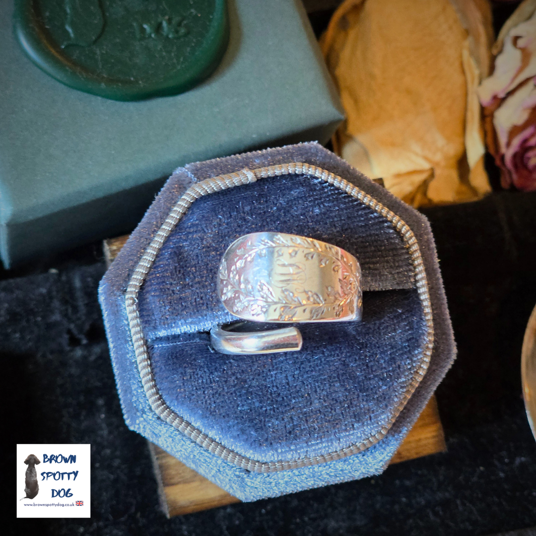 This elegant ring is meticulously crafted from a repurposed sterling silver spoon, originally hallmarked by the Glasgow Assay Office in 1893. Weighing 6.6 grams, the piece retains its original hallmark, preserving its historical authenticity. It has been legally transformed into a unique item of jewellery in accordance with the Hallmarking Act of 1973. Each ring is accompanied by an official certificate of conversion and a unique reference number, ensuring its provenance and compliance.