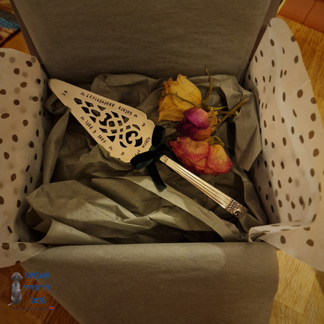 Silver Plate Vintage Cake Slice, tied with a racing green velvet ribbon.